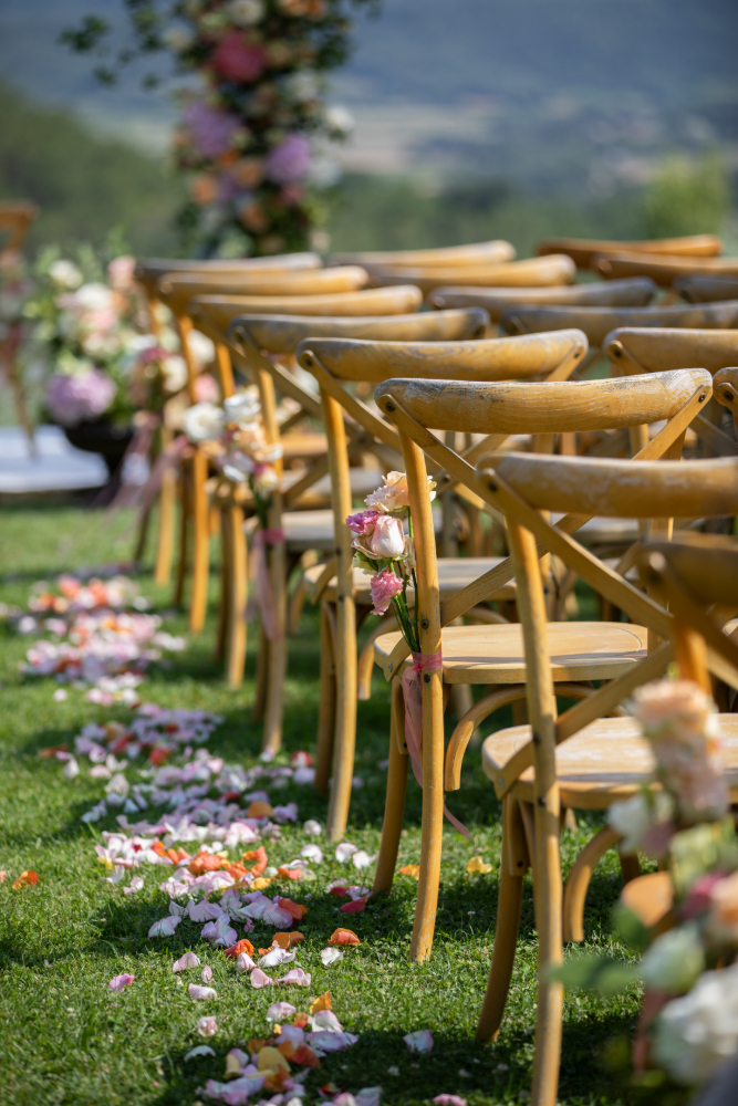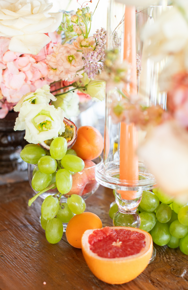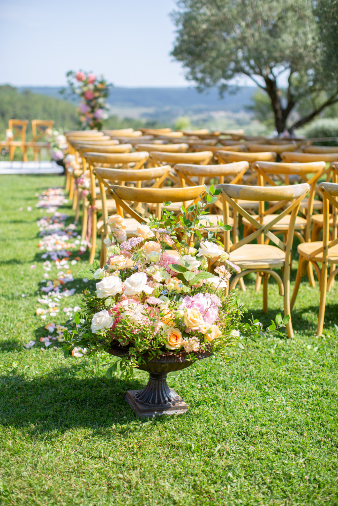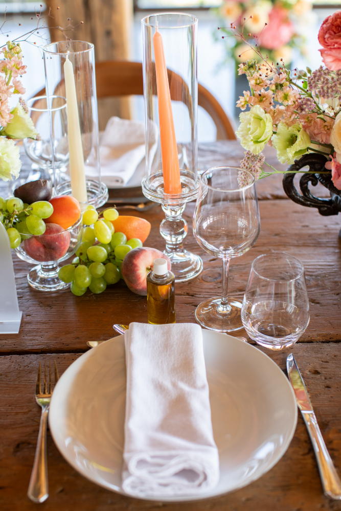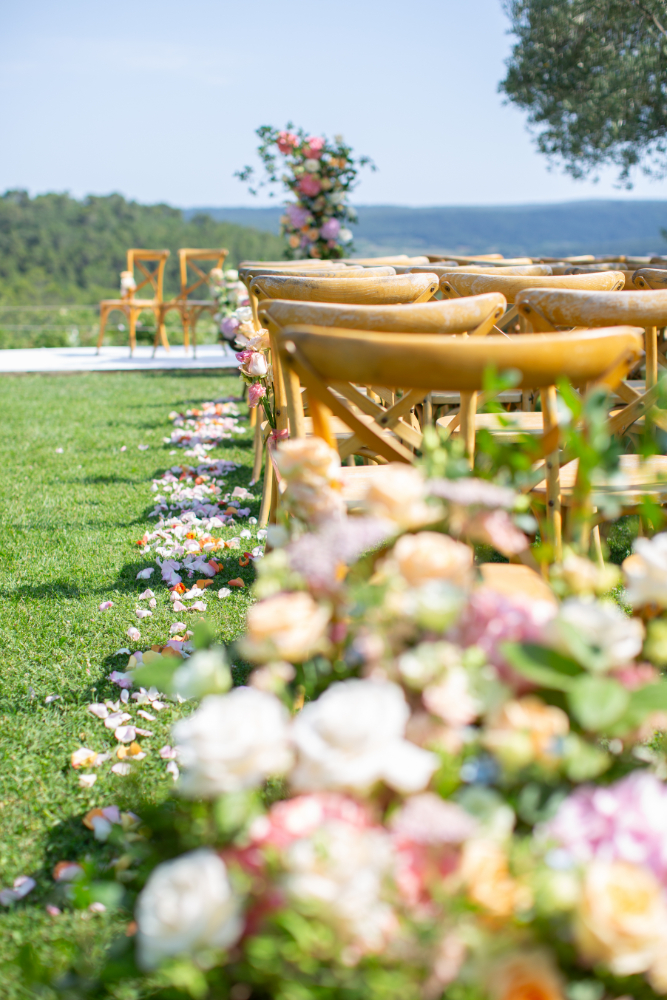 Le design floral a été imaginé sur mesure, en parfaite adéquation avec le lieu et les attentes des mariés. Une scénographie délicate et raffinée, mêlant des couleurs douces à des fleurs légères et élégantes, sublimées par l’intégration de fruits de saison tels que les pêches, les abricots et autres . Ces éléments naturels apportent chaleur, fraîcheur et poésie à l’ensemble, tout en respectant l’identité du domaine.