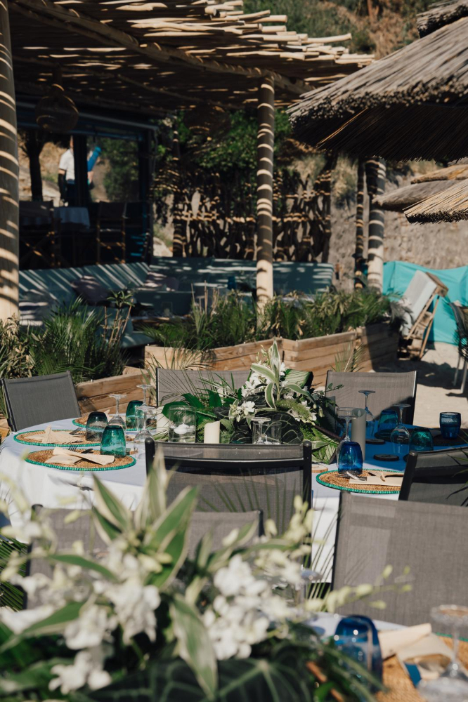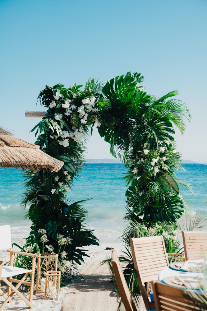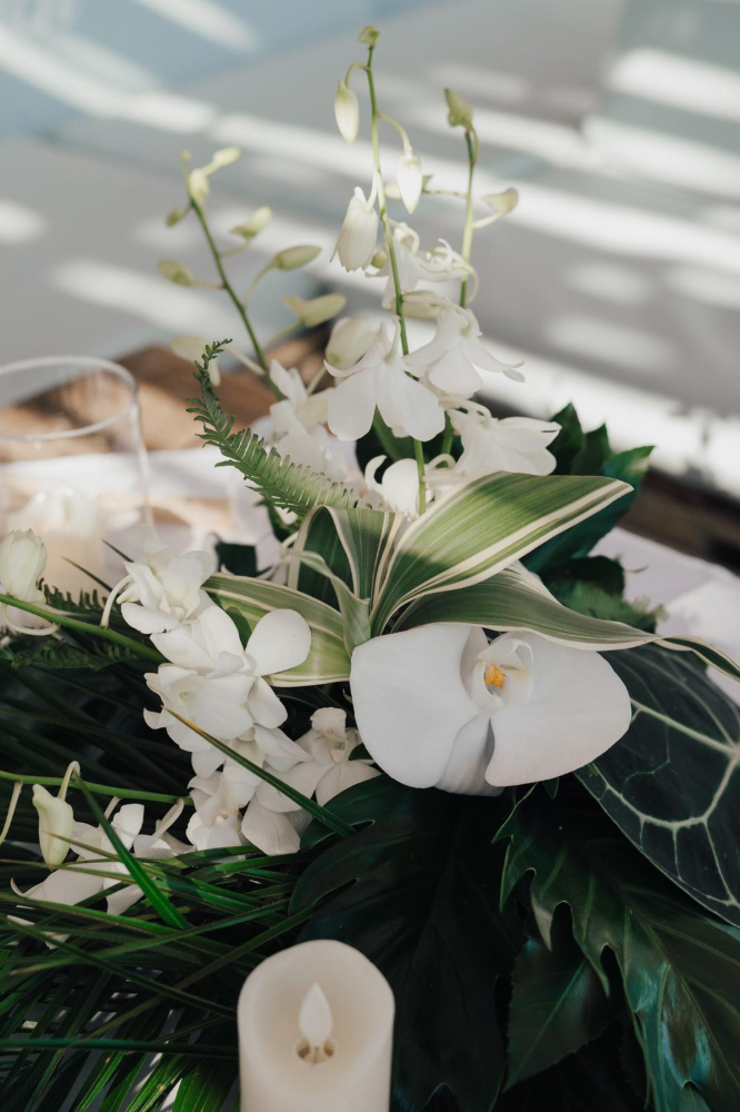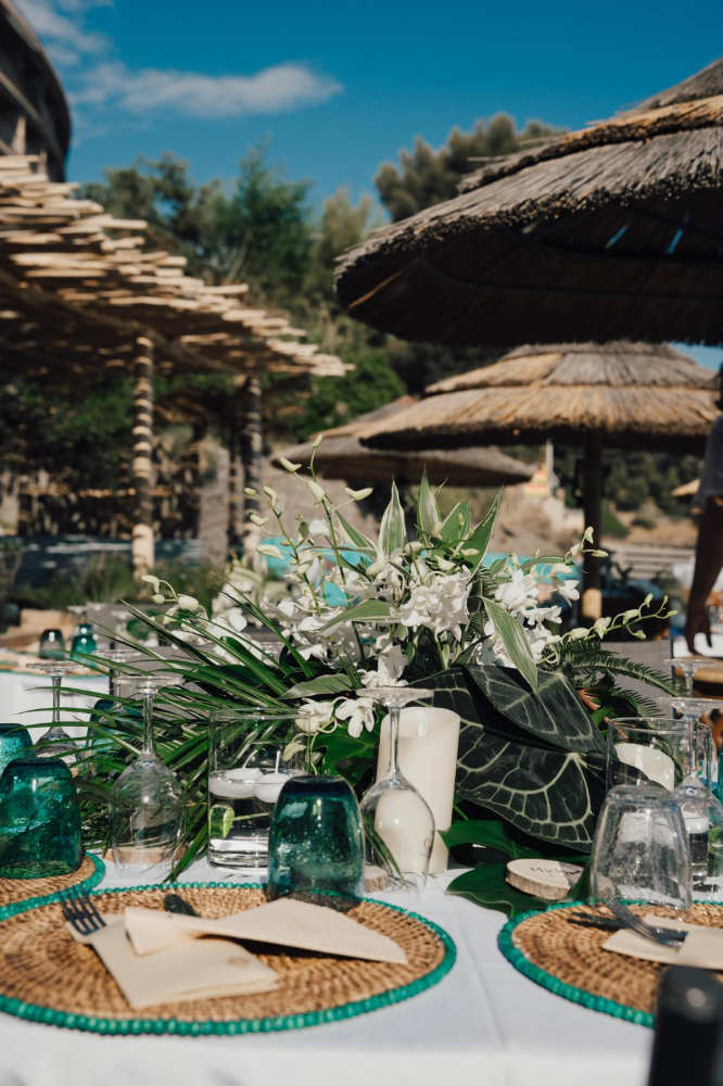 Le design floral, pensé dans un esprit jungle chic, s’intègre avec subtilité à l’environnement. Une sélection raffinée de feuillages luxuriants et de fleurs blanches vient dialoguer harmonieusement avec les nuances azur de la Méditerranée et la palette naturelle du lieu. Chaque composition florale souligne l’élégance du décor sans jamais l’éclipser, créant une scénographie organique et immersive.